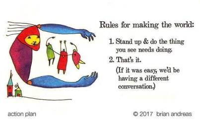 One critical component of the world-wide growth period that is going on right now is in regards to action versus contemplation. Many well-intentioned people have been sorely out of balance with this dichotomy. Effectively being spiritual in a material world in the present time frame requires both body and mind. Action without direction from the indwelling divine is busy work. Focusing one’s mental energy on spiritual goals is very important but not sufficient. We are being called to act in conjunction with and at the behest of Mother Earth and our fellow inhabitants. Image by Brian Andreas used in accordance with Fair Use principals.