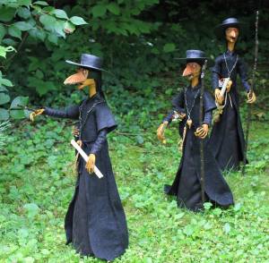 Human history has had multiple times in which viruses and other smaller forms of life break down our man-made defenses when we become seriously out of balance with Nature. The Bubonic Plague that killed 200 million people in the 1300s, smallpox that disseminated 56 million in the 1500s and the Spanish flu that killed close to 50 million in 1918-1919 are just a few such episodes. These figures of “Plague Doctors” were done by Susan Reisner and are used in accordance with Fair Use principals.